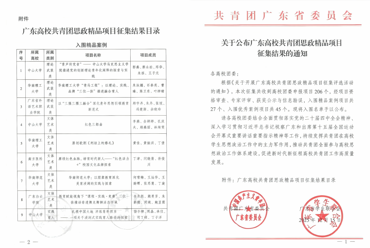 第一项成果通过“课程・实践・竞赛”三位一体模式,推动非遗舞龙舞狮活态传承,入选广东高校共青团思政精品项目。项目累计覆盖学生超2000人次,实现非遗传承与思政育人有机结合。