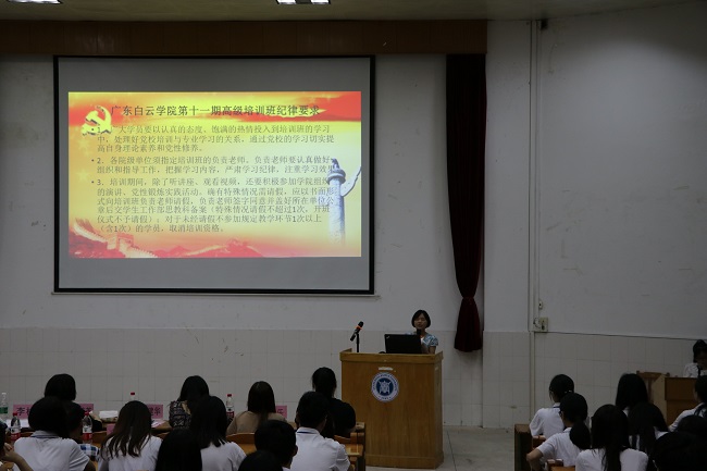 2017年5月11日下午,广东白云学院党校第十一期高级培训班开班仪式在思齐楼312顺利举行。校党委副书记李纯英、党委宣传部部长李林、党委组织部副部长李建华、各二级学院学生党支部书记代表及本次高级培训班200余名学员参加了本次开班典礼,仪式由学工部何坤老师主持。