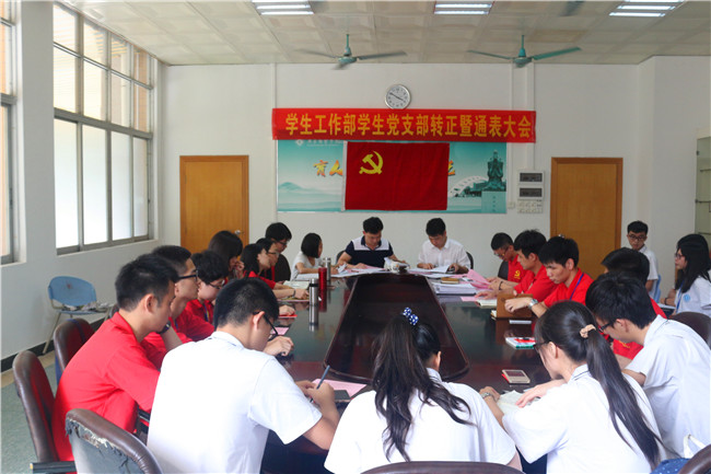 2015年5月29日下午,学生工作部学生党支部于学生处会议室召开了发展对象通表暨预备党员转正大会,本次大会讨论关于纪嘉煜等6名发展对象申请转为预备党员的问题及陶境峰等7名预备党员按期转为正式党员的问题。出席本次大会的人员有党支部书记张泽彬、校党委组织部副部长李建华、团委副书记段立、艺术指导中心副主任卿枫、学生党员、发展对象及转正党员。