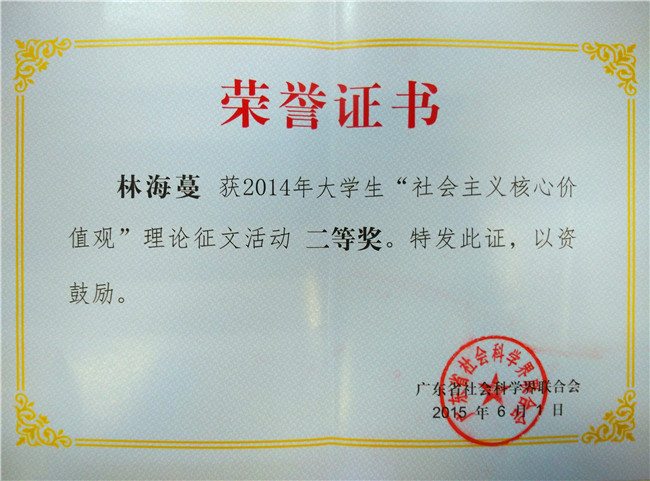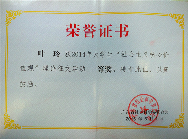 日前,广东省社会科学界联合会公布了2014年大学生“社会主义核心价值观”理论征文获奖情况,我校党委宣传部获得“组织奖”;我校机电工程学院的叶玲同学撰写的文章《论社会主义核心价值观》获得“一等奖”;我校财经学院的林海蔓同学撰写的文章《那些星光熠熠的平凡人》获得“二等奖”。