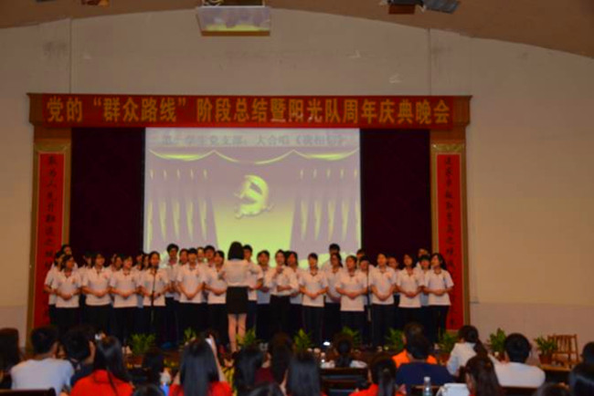 紧接着,各支部精心组织具有时代性、创新性、代表性的晚会节目把晚会推向高潮。首先上场的是一支部的民族舞《北方有佳人》、接着是二支部的相声《女儿赞》、三支部的交谊舞《舞之灵魂》及诗朗诵《我们的微笑》、四支部的歌曲串烧《歌唱祖国》,五支部的小品《多管闲事》。一幕幕精彩绝伦的节目让同学们目不暇接,掌声雷动,整场晚会紧紧围绕“党的群众路线实践教育活动阶段工作总结暨阳光队周年庆典”主题并在欢快的全体合唱《我相信》歌曲中拉下帷幕。