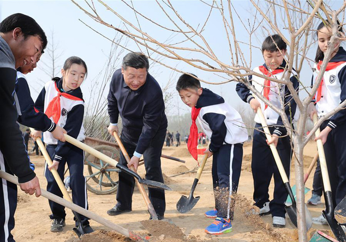 挥锹铲土填入树坑,培实新土堆起围堰,习近平接连种下白皮松、西府海棠、银杏、碧桃、榆叶梅。每种下一棵树苗,习近平都同少先队员一起提桶浇水,还不时询问他们学习生活的情况。习近平表示,我国历来就有在清明节前后植树的传统。全民义务植树的一个重要意义,就是让大家都树立生态文明的意识,形成推动生态文明建设的共识和合力。每年这个时候与同学们一起植树,感到很高兴。希望同学们从小树立保护环境、爱绿护绿的意识,既要懂道理,又要做道理的实践者,积极培育劳动意识和劳动能力,用自己的双手为祖国播种绿色,美化我们共同生活的世界。