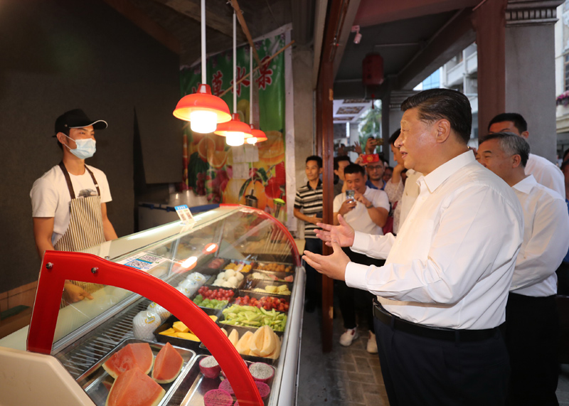 10月12日至13日,中共中央总书记、国家主席、中央军委主席习近平在广东考察。这是13日下午,习近平在汕头市小公园开埠区,同商铺店员亲切交流,了解复商复市和常态化疫情防控情况。新华社记者 鞠鹏 摄