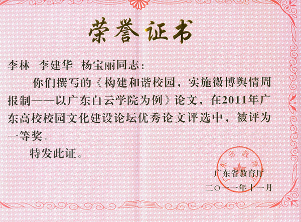 2012年6月,由李林、李建华、杨宝丽撰写的《微博舆情周报制的探索与实践》在“首届全国民办高校党的建设和思想政治工作优秀成果”评比中荣获一等奖。是广东省唯一获此殊荣的民办高校。