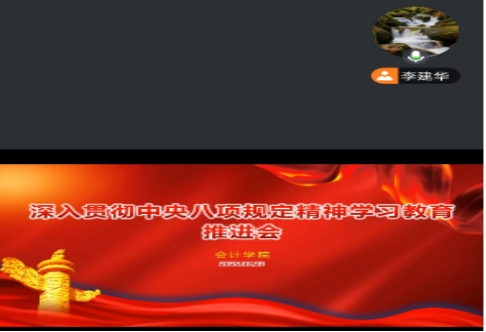 为了推进深入贯彻落实中央八项规定精神学习教育走深走实,2025年7月23日晚上,会计学院党委通过腾讯会议召开深入贯彻中央八项规定精神学习教育推进会。深入学习习近平总书记在中央政治局第二十一次集体学习时的重要讲话精神,学习贯彻省委教育工委学习教育工作推进会精神、学校党委会议精神。会议由学院党委书记李建华主持,学院党政班子成员、各党支部书记参加会议。