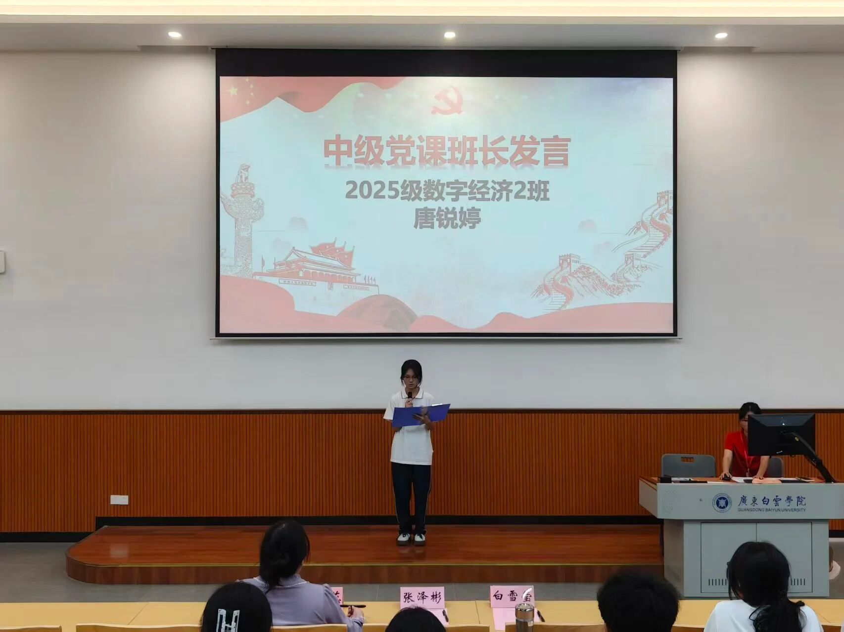 紧接着,中级党课班长2025级数字经济2班唐锐婷发言,衷心感谢党组织与老师提供本次中级党课学习机会,助力学员向党组织靠拢。此次党课是思想进步的重要台阶,将会系统学习党的理论、历程与使命,锤炼三观。最后,她并代表全体学员承诺会珍惜机会、认真学习、遵守纪律,将理论与实践结合,学以致用,以饱满热情开启学习之旅,争取思想与能力的提升,预祝培训班圆满成功。